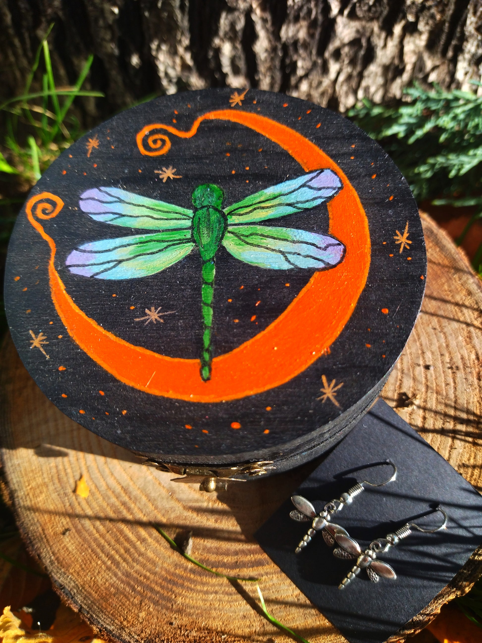 Esta cajita está pintada a mano e incluye unos pendientes libélula.