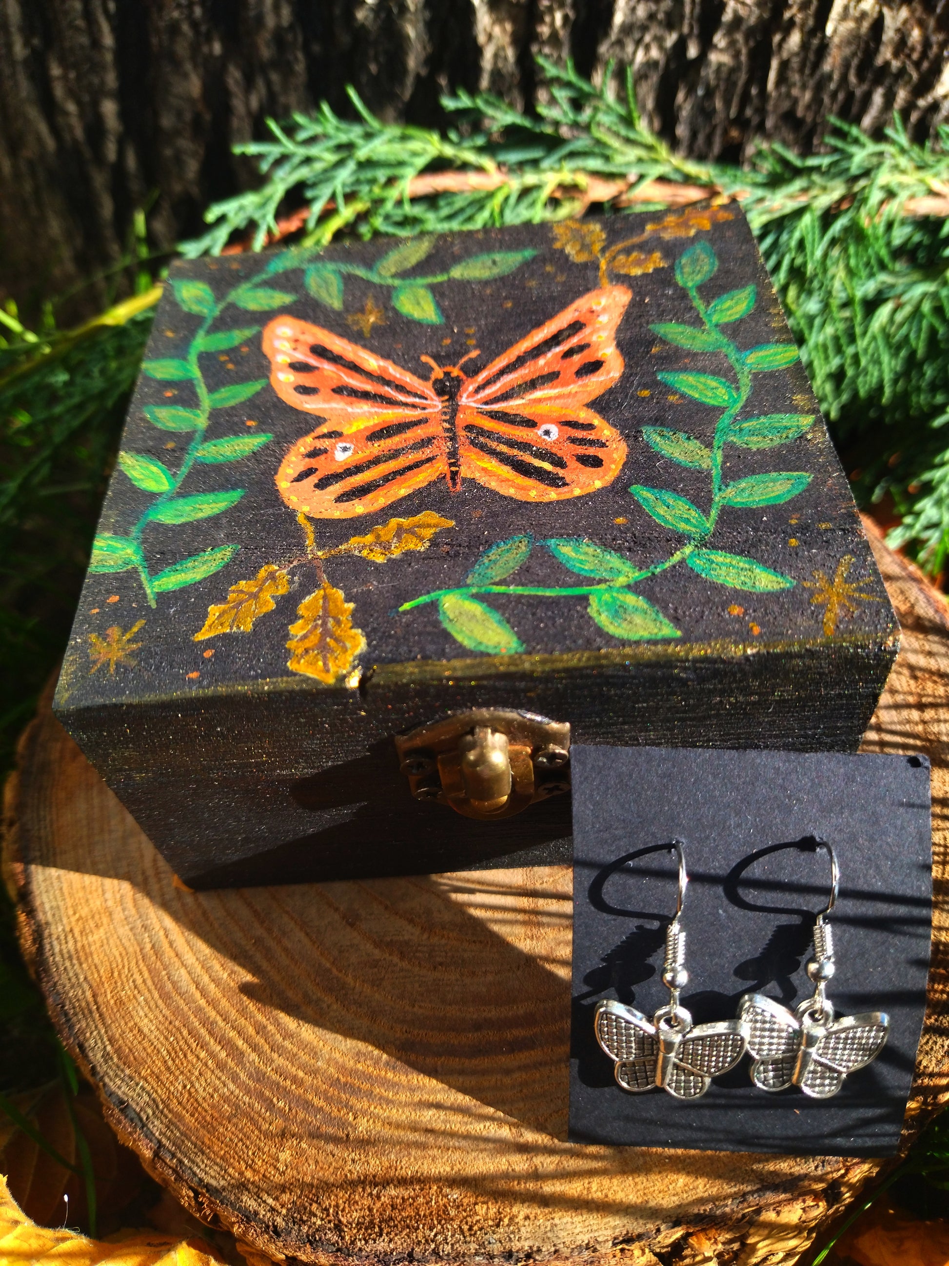 Esta cajita está pintada a mano e incluye unos pendientes mariposa.