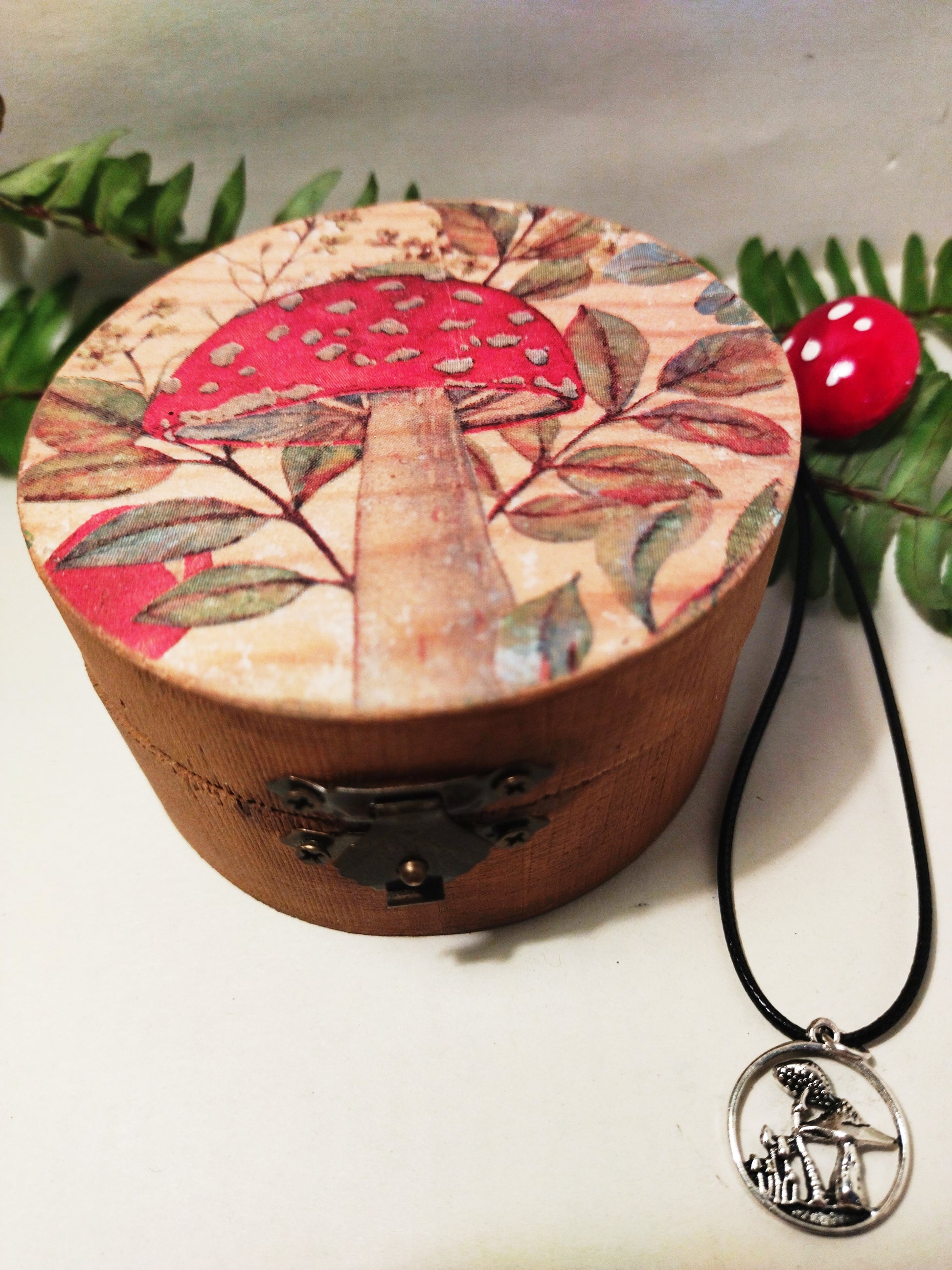 Esta cajita es absolutamente encantadora. Está decorada con la técnica decoupage y incluye un colgante de setas.